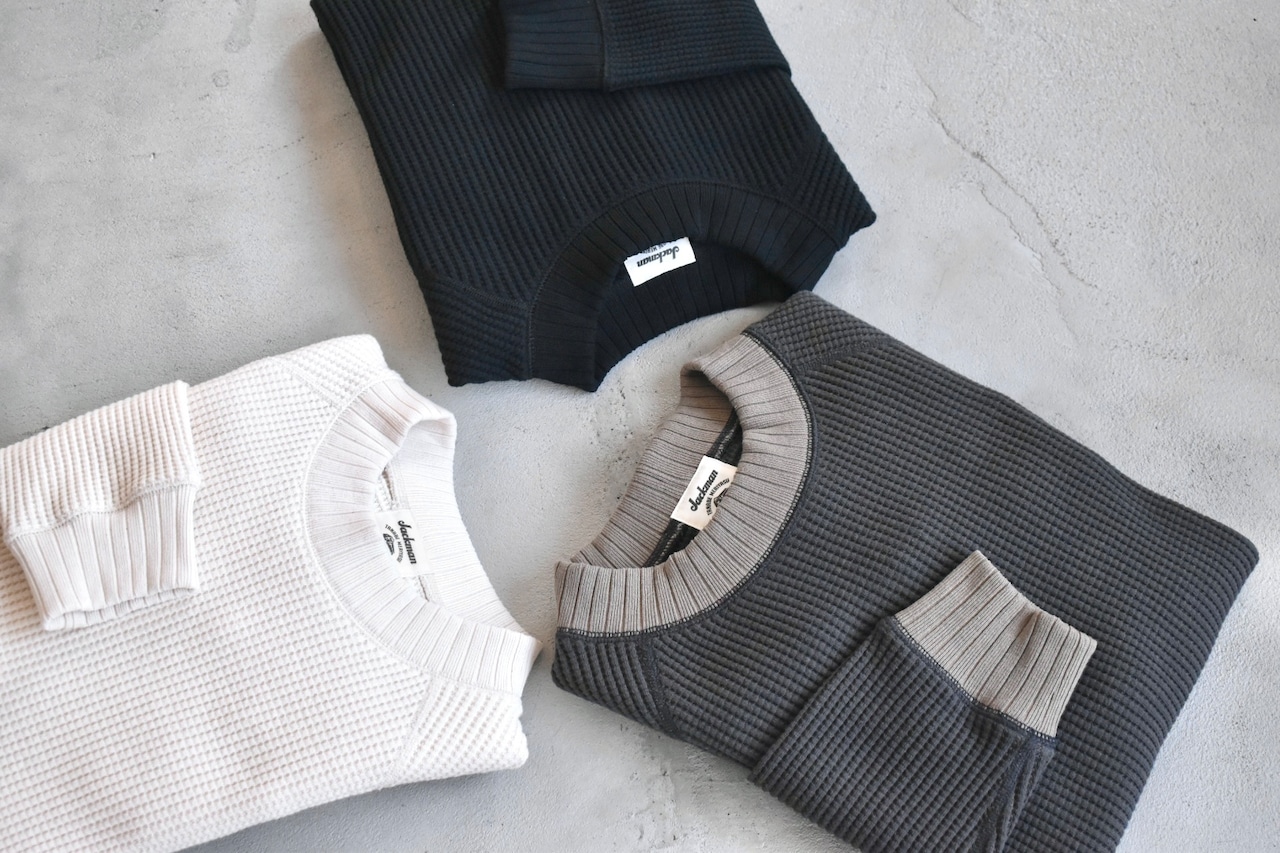 首元、袖口、裾は軽さがあり硬めの針抜きリブを使用していますので