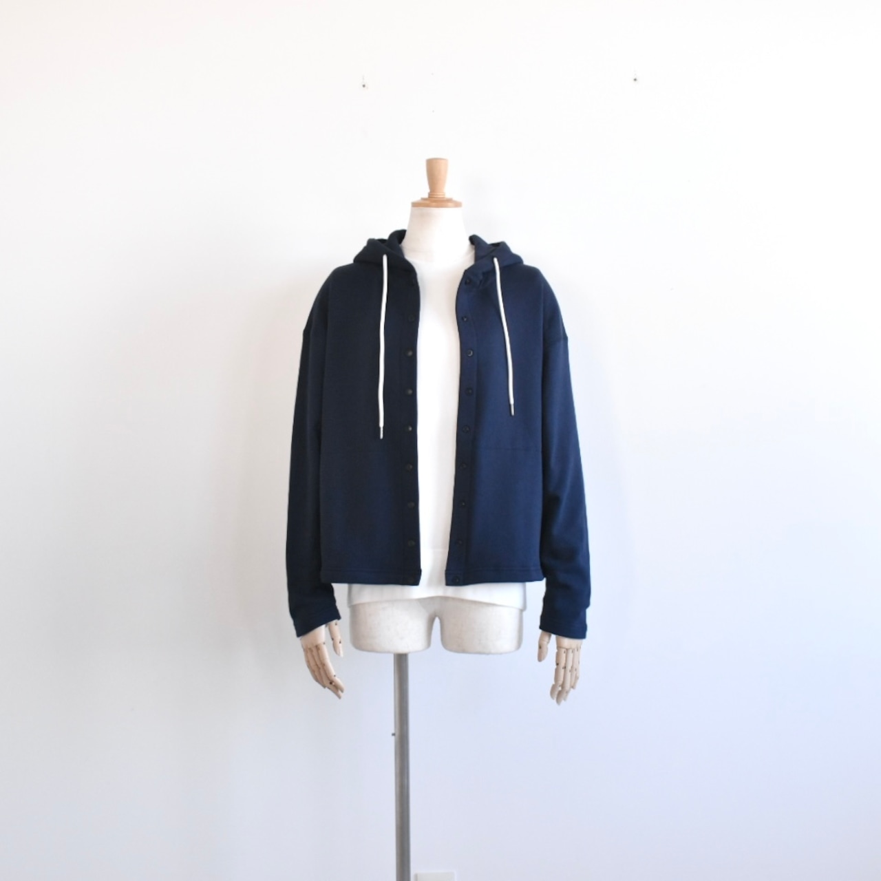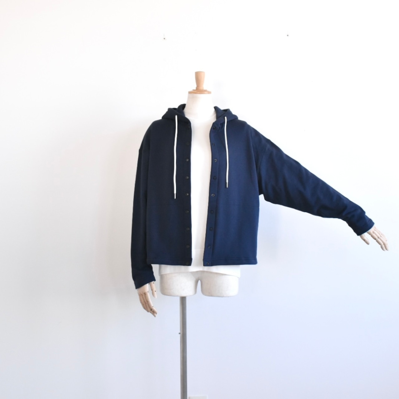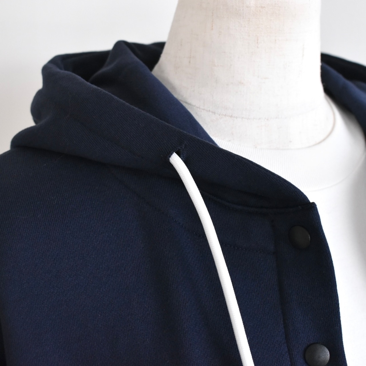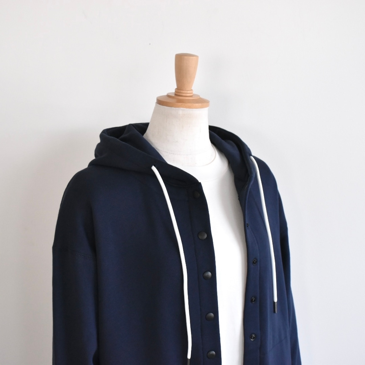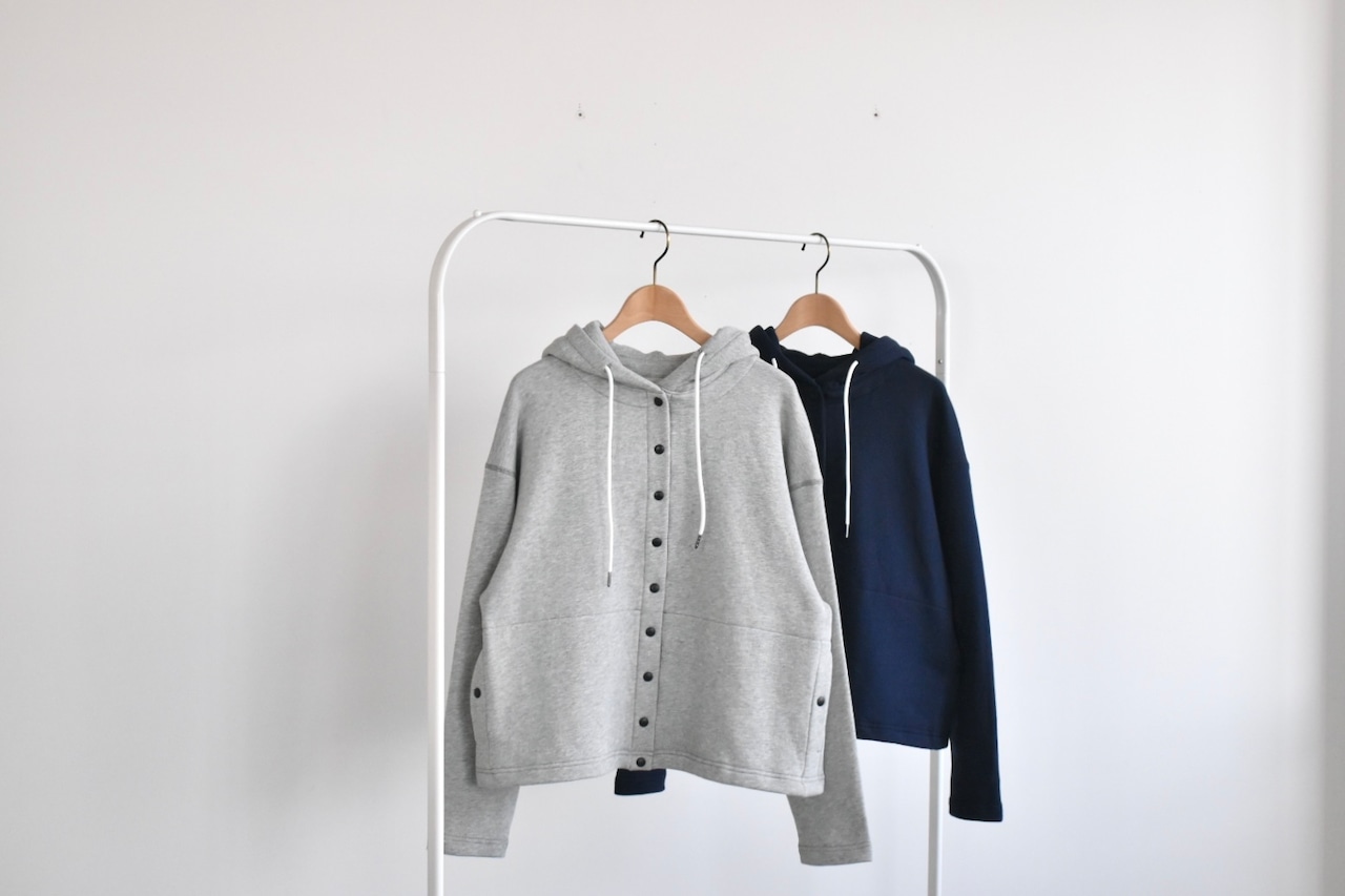 フーディーとしては珍しくファスナーではなくボタンデザインなので、
